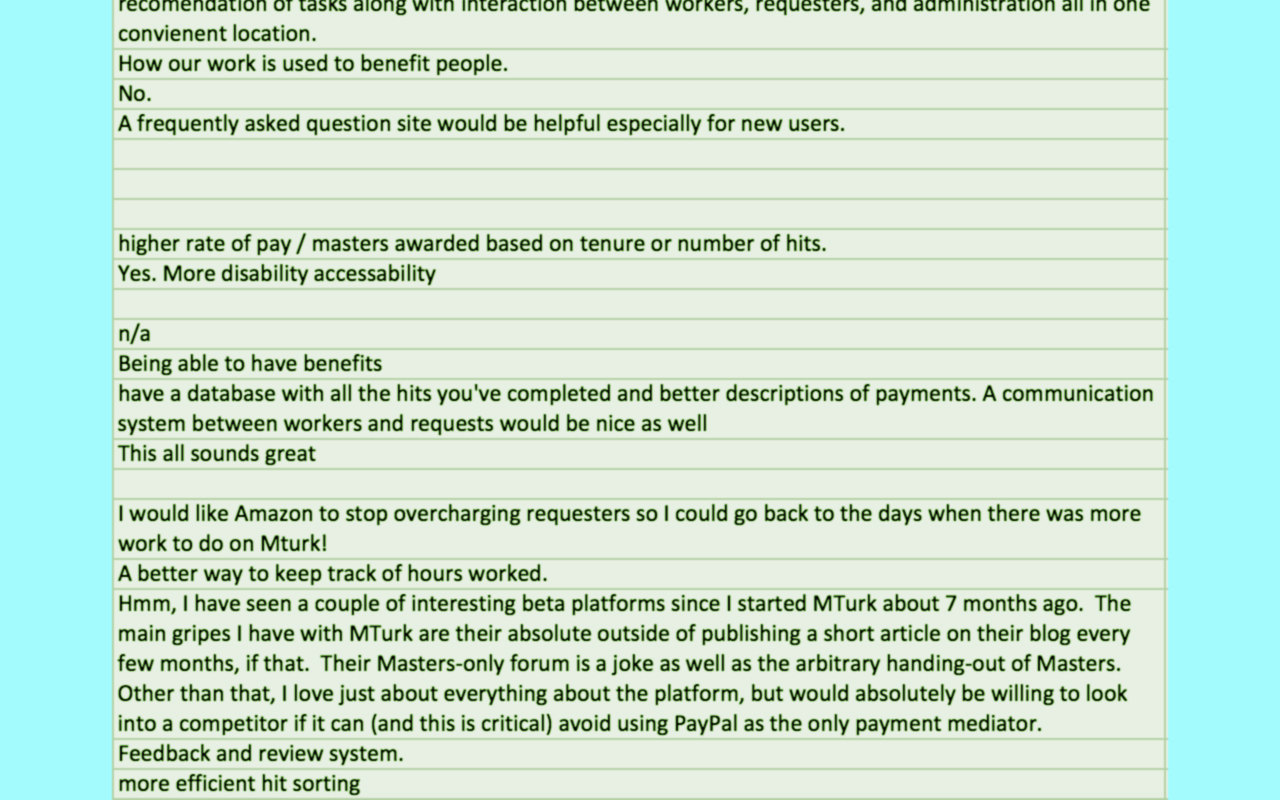 I’m delighted to be included in this monumental coming together–the third in a series of conferences at the intersection of the internet, society, and labor hosted this year by Trebor Scholz and Nathan Schneider. I’ll be providing an introduction to the “Worker’s Voice” session, with a brief nod towards some of my creative collaborations with Mechanical Turk workers and some survey findings of an experiment I ran on Mturk to determine which dimensions of online work were important to the workers. My presentation is not as great without my voice over, but you can see the visuals (including some survey findings) here.