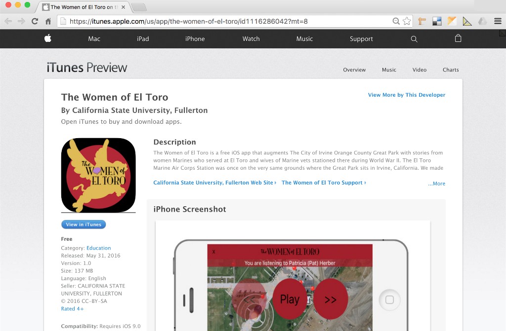 The Women of El Toro (xtine burrough and Dan Sutko) pairs stories told by female veterans and military wives stationed at Marine Corps Air Station El Toro with locations on the same ground, in the Orange County Great Park. Originally recorded by the Center for Oral and Public History from 2007-13, these stories are now made available in a free iOS app to bring the voices of the women whose experiences in or with the Marines to visitors at Great Park locations. In broader terms, Dan and I are excited about the poetic way that The Women of El Toro lies at the intersection of locative GPS technology, digital oral histories of female veterans, and digital humanities work emphasizing the creation of new human experiences through new media, space, and place.