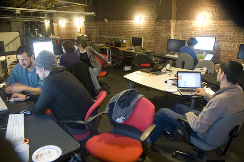 For three days in February 2009 Adam Hyde and the members of the FLOSSmanuals.net collective convened at Eyebeam in NYC to translate xtine burrough and Michael Mandiberg’s new CC-licensed textbook Digital Foundations from the Adobe Creative Suite to open-source software, including Inkscape, Gimp, Scribus, Kompozer, and Processing. It was a wild weekend and remains unbelievable to me how a book that took us over a year to write was translated in less than half a month. Thanks to Michael for sharing this photo.