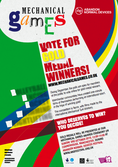Voting begins next month at the Mechanical Games website. Part of the Abandon Normal Devices (AND) Festival, this version of the Games is produced by myself with a lot of help from Cornerhouse. New to the Games: a real, live award ceremony, to take place on October 3rd from noon – 2 at Cornerhouse, Manchester, UK. Even if you can’t make it to the awards ceremony, you can vote on the gold medalists from September 1 – 30th.